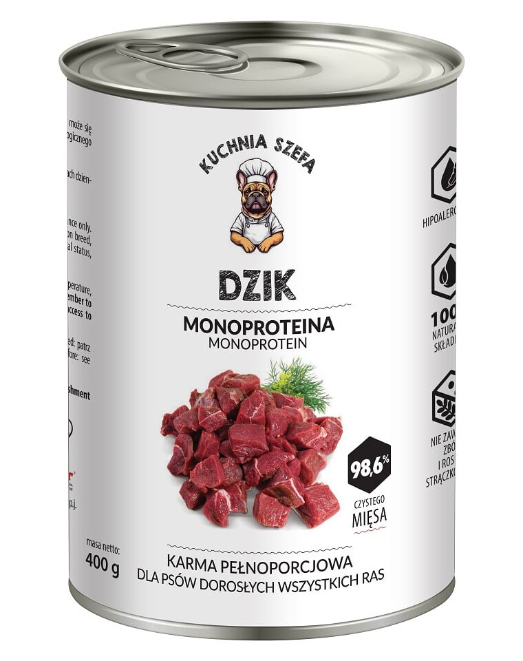 Kuchnia Szefa Wildschwein Monoproteinowa ist eine Hommage an den Hundetrieb und die ursprüngliche Ernährung des Raubtiers. Wildschweinfleisch, reich an Protein und gesunden Fetten, liefert Energie und einen einzigartigen Geschmack, der mit keinem anderen verwechselt werden kann. Es ist ein Angebot für Hunde, die eine wirklich natürliche, fleischliche Mahlzeit verdienen – ohne Kompromisse.
