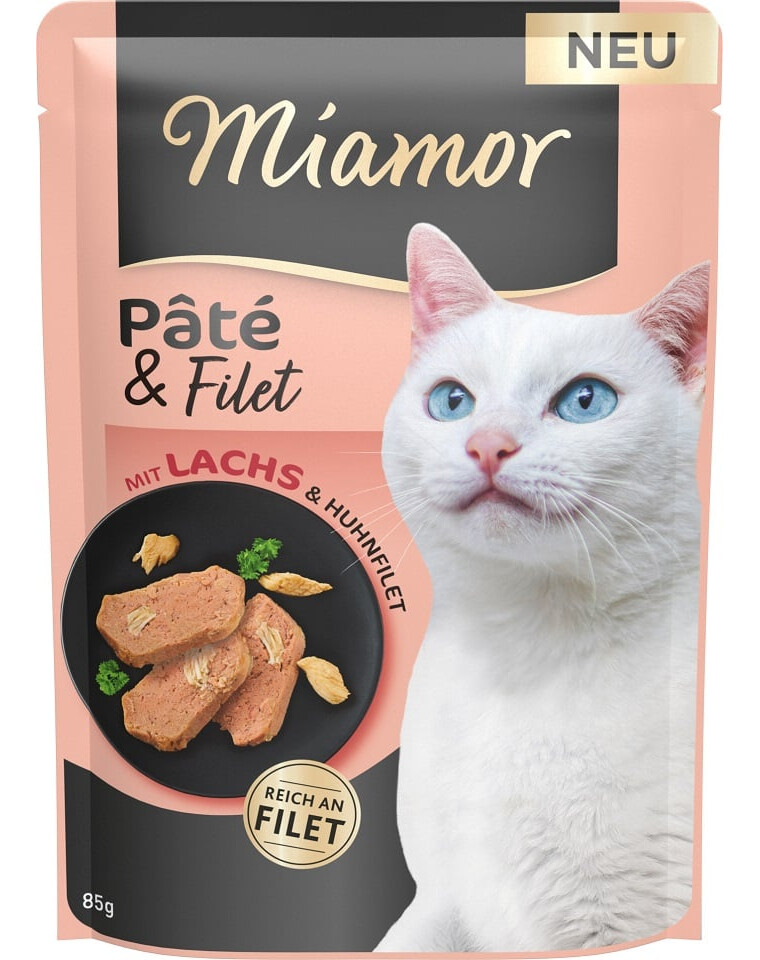 Miamor Pate & Filet - ausschließlich reines Fleisch und Innereien von höchster Qualität. Ergänzt mit sichtbaren, hochwertigen Hühnerfiletstücken, bietet es eine verlockende Portion Nahrung für das tägliche Wohlbefinden anspruchsvoller Katzen. Die verwendeten Fleischsorten sind eine wertvolle Quelle für Eiweiß, Vitamin D und Taurin. Getreidefreie, glutenfreie und zuckerfreie Rezeptur, ohne Farb- und Konservierungsstoffe.
