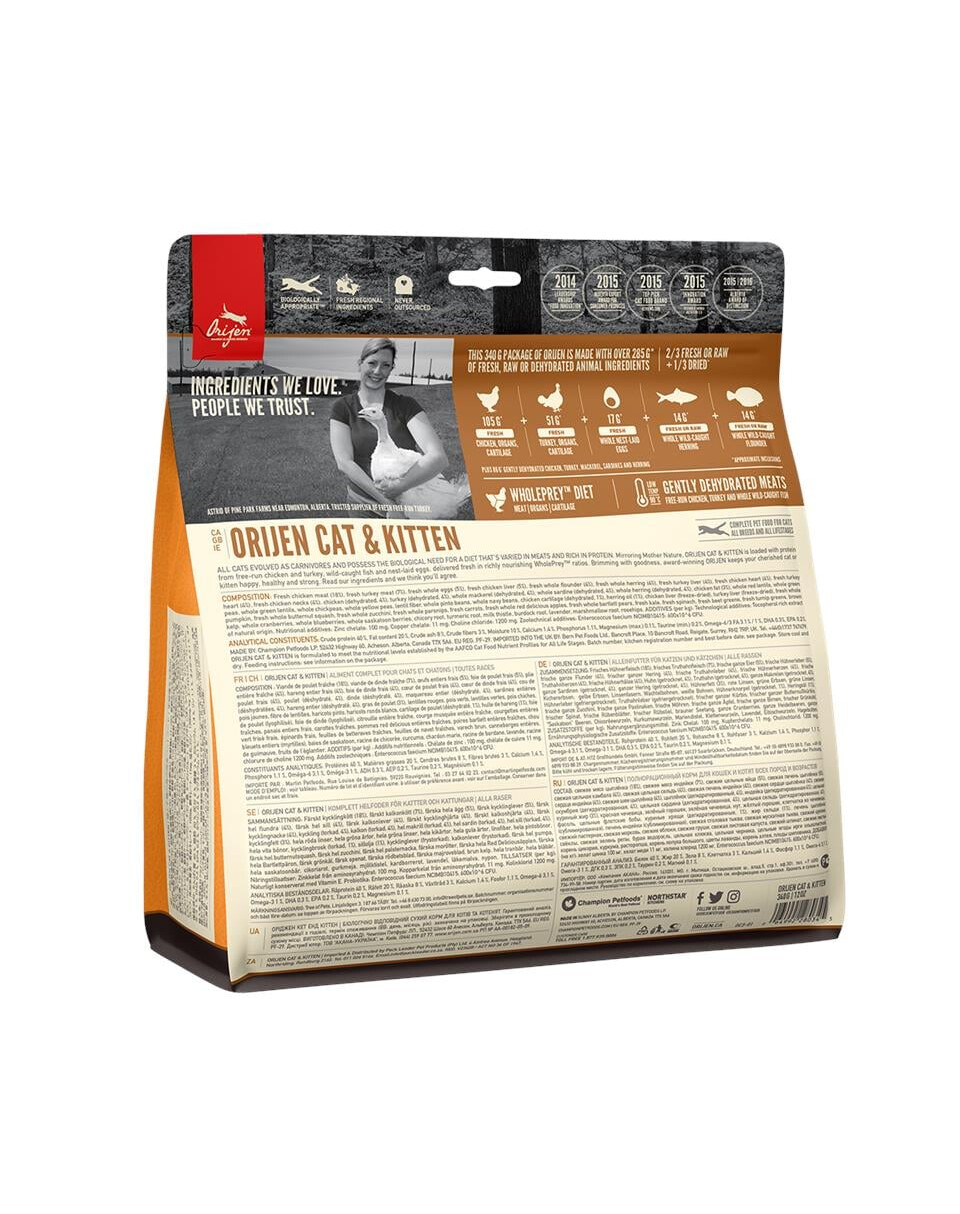 Die innovative Formel, die von den Spezialisten von Orijen entwickelt wurde, basiert auf proteinreichen tierischen Produkten. Orijen Cat & Kitten ist ein Futter, das zu 85% aus Fleischbestandteilen besteht. Dazu gehören frisches und ganzes Fleisch von Hühnern, Puten - und deren Lebern - sowie ganze und frische Fische wie Flunder und Hering. Ergänzt werden sie durch Puten- und Hühnerherzen. Die restlichen 15 % der Zusammensetzung bestehen aus Obst und Gemüse, das so ausgewählt wurde, dass es die höchstmögliche Dosis an Vitaminen und ergänzenden Stoffen enthält: Karotten, rote Äpfel, rote Beete, Preiselbeeren, Kürbis in zwei Sorten, Birnen und Heidelbeeren. Für ein besonderes Aroma sorgen Lavendel und Hagebutten. Das Futter ist universell einsetzbar, d.h. es eignet sich sowohl für Katzen, die die meiste Zeit im Haus verbringen, als auch für solche, die einen aktiven Lebensstil führen. Orijen enthält kein Getreide, was die Energiereserven des täglichen Lebens noch effektiver auffüllt.
