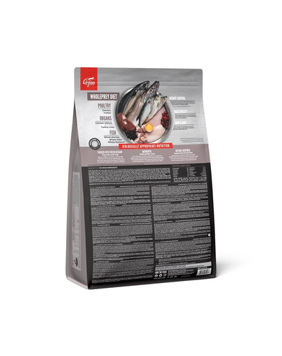 Frisches Hühnerfleisch (14%), frische ganze Eier (6%), frischer ganzer Hering (6%), frisches Putenfleisch (6%), frische Hühnerleber (6%), frische ganze Pazifik-Bastardmakrele (4%), frische Putenleber (4%), frischer Pazifik-Hecht (4%), frische Hühnerherzen (4%), frische Putenherzen (4%), Hühnerfleisch (getrocknet, 4%), Putenfleisch (getrocknet, 4%), ganze Makrele (getrocknet, 4%), ganze Sardine (getrocknet, 4%), ganzer Hering (getrocknet, 4%), ganze Atlantik-Makrele (getrocknet, 4%), Linsenfasern, ganze rote Linsen, ganze grüne Linsen, ganze grüne Erbsen, ganze Kichererbsen, ganze gelbe Erbsen, ganze Pintobohnen, ganze weiße Bohnen, Hühnerknorpel (getrocknet, 1%), frisches Putenherz (1%), blauer Wittling (getrocknet, 1%), Hühnerfett (0,5%), getrocknete Algen (natürliche Quelle von DHA und EPA), Kürbis (getrocknet), Moschus-Kürbis (getrocknet), Karotten (getrocknet), getrockneter brauner Seetang, Hühnerleber (gefriergetrocknet), Putenleber (gefriergetrocknet), frisches Kürbis, frischer Butternut squash, Zucchini, Pastinake, frische ganze Karotten, frische Red Delicious Äpfel, frische Bartlett Birnen, frische Cranberries, frische Heidelbeeren, Erlen-Felsenbirne, frischer Grünkohl, frischer Spinat, rote Beete, Rübstiel, Chicoréewurzel, Kurkuma, Mariadistel, Klettenwurzel, Lavendel, Eibischwurzel, Hagebutten.