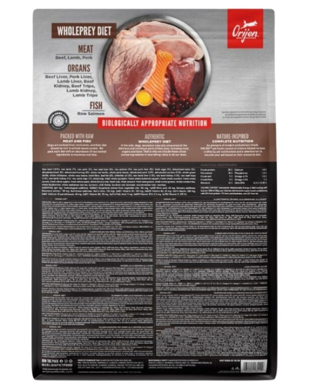 ZUSAMMENSETZUNG: rohes Rindfleisch (18,5%), rohes Lammfleisch (7%), rohes Schweinefleisch (7%), rohe Rinderleber (5%), roher Lachs (5%), rohe Schweineleber (5%), frische Eier (5%), dehydriertes Lammfleisch (5%), dehydriertes Rindfleisch (5%), dehydrierter Hering (5%), ganze rote Linsen, ganze Pintobohnen, getrocknetes Schweinefleisch (3,5%), getrocknete Sardinen (3,5%), ganze grüne Linsen, ganze Kichererbsen, ganze weiße Bohnen, Linsenfasern, Rinderfett (2%), Weißfischöl (2%), rohe Lammleber (1,5%), rohe Rinderniere (1,5%), roher Rindermagen (1,5%), rohe Lammniere (1%), roher Lammmagen (1%), getrockneter Seetang, frischer ganzer Kürbis, frische ganze Zucchini, frische ganze Karotte, frischer ganzer Apfel, frische ganze Birne, getrocknete Zichorienwurzel, frischer Grünkohl, frischer Spinat, frische Rote-Bete-Blätter, frische Rübenblätter, ganze Preiselbeeren, ganze Heidelbeeren, ganze Saskatoonbeeren, Kurkuma, Mariendistel, Klettenwurzel, Lavendel, Baldrianwurzel, Hagebutten.