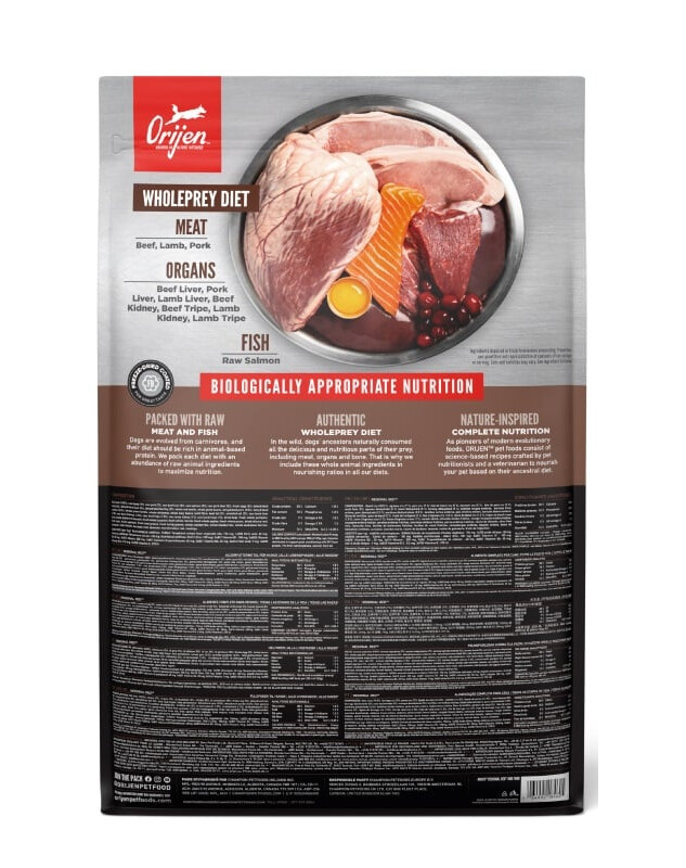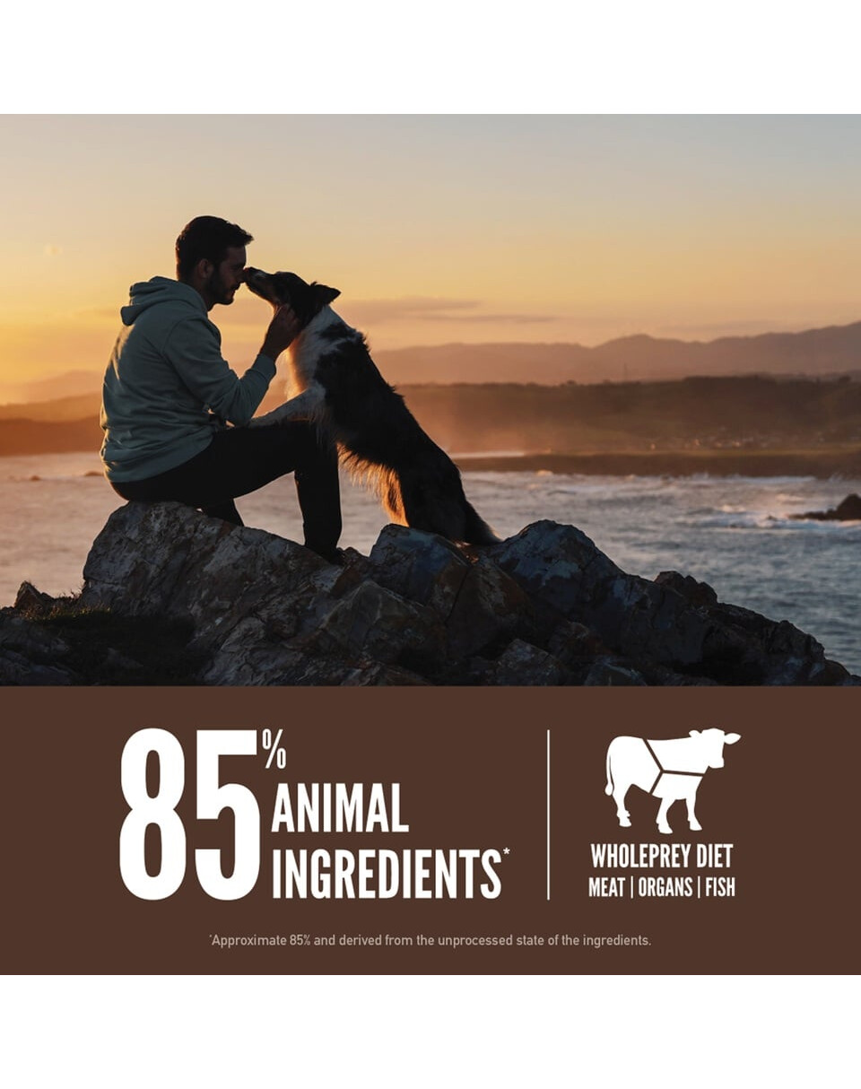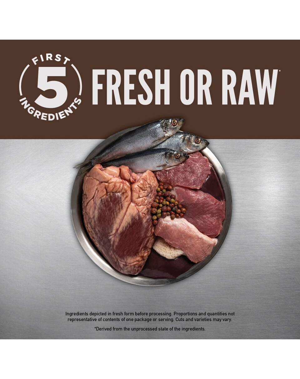 ZUSAMMENSETZUNG: rohes Rindfleisch (18,5%), rohes Lammfleisch (7%), rohes Schweinefleisch (7%), rohe Rinderleber (5%), roher Lachs (5%), rohe Schweineleber (5%), frische Eier (5%), dehydriertes Lammfleisch (5%), dehydriertes Rindfleisch (5%), dehydrierter Hering (5%), ganze rote Linsen, ganze Pintobohnen, getrocknetes Schweinefleisch (3,5%), getrocknete Sardinen (3,5%), ganze grüne Linsen, ganze Kichererbsen, ganze weiße Bohnen, Linsenfasern, Rinderfett (2%), Weißfischöl (2%), rohe Lammleber (1,5%), rohe Rinderniere (1,5%), roher Rindermagen (1,5%), rohe Lammniere (1%), roher Lammmagen (1%), getrockneter Seetang, frischer ganzer Kürbis, frische ganze Zucchini, frische ganze Karotte, frischer ganzer Apfel, frische ganze Birne, getrocknete Zichorienwurzel, frischer Grünkohl, frischer Spinat, frische Rote-Bete-Blätter, frische Rübenblätter, ganze Preiselbeeren, ganze Heidelbeeren, ganze Saskatoonbeeren, Kurkuma, Mariendistel, Klettenwurzel, Lavendel, Baldrianwurzel, Hagebutten.