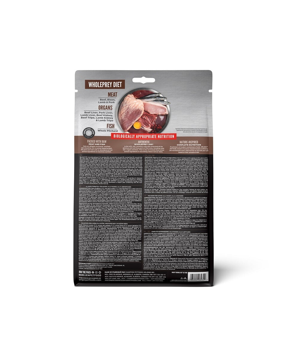 Rohes Rindfleisch (13%), rohe ganze Sardinen (11%), rohes Bison (5%), rohes Lamm (5%), rohes Schweinefleisch (5%), rohe Rinderleber (5%), rohe Schweineleber (5%), frische Eier (4%), dehydriertes Lammfleisch (4%), dehydriertes Rindfleisch (4%), dehydrierter Hering (4%), dehydrierte Sardine (4%), dehydriertes Hammelfleisch (4%), dehydriertes Schweinefleisch (4%), Rapsöl, ganze rote Linsen, ganze Erbsen, ganze Kichererbsen, ganze grüne Linsen, Erbsenstärke, Weißfischöl (2%), rohe Lammleber (2%), getrockneter Alaska-Seelachs (2%), ganze Pintobohnen, ganze Bohnen, Linsenfasern, rohe Rinderniere (0,5%), roher Rindermagen (0,5%), rohe Lammniere (0,5%), rohe Lammkutteln (0,5%), getrocknete Algen, frischer ganzer Kürbis, frische ganze Zucchini, frische ganze Karotte, frischer ganzer Apfel, frische ganze Birnen, getrocknete Zichorienwurzel, frischer Grünkohl, frischer Spinat, frischer Mangold, frische Rübenblätter, ganze Cranberries, ganze Heidelbeeren, ganze Heidelbeeren, Kurkuma, Distel, Klettenwurzel, Lavendel, Baldrianwurzel, Hagebutten.
