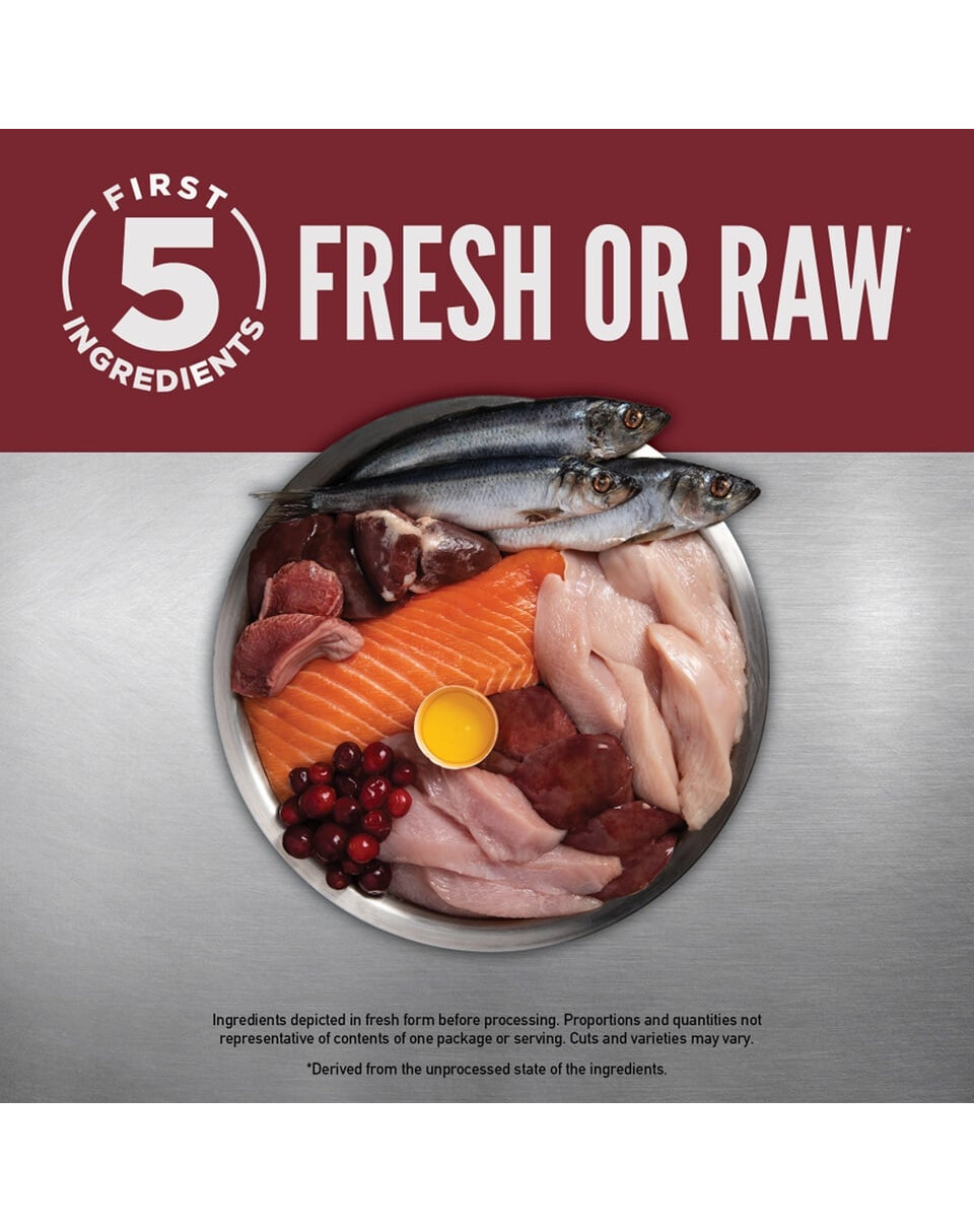 Frisches Putenfleisch (15%), frisches Hühnerfleisch (13%), rohes Wachtelfleisch (4%), frische tiefblättrige Eier (4%), roher ganzer Steinfisch (4%), roher ganzer Hering (4%), frische Putenleber (4%) ), frische Hühnerleber (4%), frisches Hühnerherz (4%), frisches Putenherz (4%), dehydriertes Putenfleisch (4%), dehydriertes Hühnerfleisch (4%), dehydrierter Hering (4%), dehydrierte Hühnerleber (4%) , dehydrierte ganze Eier (4%), ganze rote Linsen, ganze Bohnen, ganze grüne Linsen, Hühnerfett (3%), ganze Kichererbsen, Linsen, ganze Erbsen, Putenknorpel (0,5%), Hühnerknorpel (0,5%), gelbes Kabeljauöl (0,5%), gefriergetrocknete Hühnerleber (0,5%), neuseeländische Muscheln, frische Alge, frischer ganzer Kürbis, Salz, frische Äpfel, frische Karotten, frische Birnen, frische Zucchini, Zichorienwurzel, frische Rübenblätter, frisch Spinat, frische ganze Blaubeeren, frische ganze Preiselbeeren, Lavendel, medizinische Zilwurzel, Mariendistel, Hagebutte.