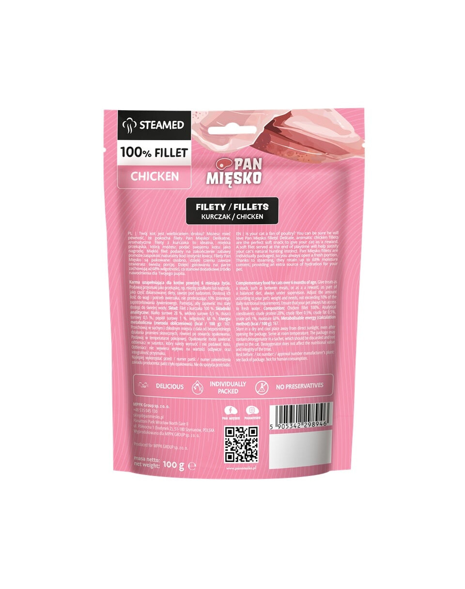 Deine Katze ist ein Fan von intensiven Geschmäckern? Du kannst sicher sein, dass sie die Filets von Pan Mięsko lieben wird! Zarte, aromatische Hähnchenfilets sind der ideale, weiche Snack, den du deiner Katze als Belohnung geben kannst. Das weiche Filet am Ende des Spiels hilft, den natürlichen Jagdinstinkt deiner Katze zu befriedigen. Die Filets von Pan Mięsko sind einzeln verpackt, sodass du immer eine frische Portion öffnest. Durch das Dampfgaren behalten sie bis zu 68% Feuchtigkeit, was eine zusätzliche Quelle der Hydration für dein Haustier darstellt.