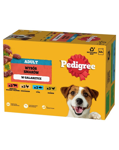 PEDIGREE Adult Choice Nassfutter in aromatischem Gelee ist ein Alleinfuttermittel für ausgewachsene Hunde. Ihr Hund wird mit vier köstlichen Geschmacksrichtungen verwöhnt: mit einer Mischung aus Rind und Leber, mit Huhn, mit Fisch und mit Geflügel. Die Rezeptur wurde von Tierärzten und Ernährungswissenschaftlern des WALTHAM Institute of Animal Science entwickelt. Sie enthält Vitamin E und Antioxidantien, die antioxidative Eigenschaften haben und die natürlichen Abwehrkräfte Ihres Hundes unterstützen, sowie Zink, das eine gesunde Haut und ein gesundes Fell unterstützt, damit Ihr Hund gut aussieht und sich wohl fühlt. Das Futter von PEDIGREE enthält natürliche Ballaststoffe und Präbiotika, die zur Gesunderhaltung des Darms beitragen, denn jeder Hund hat ein gesundes Bäuchlein verdient.