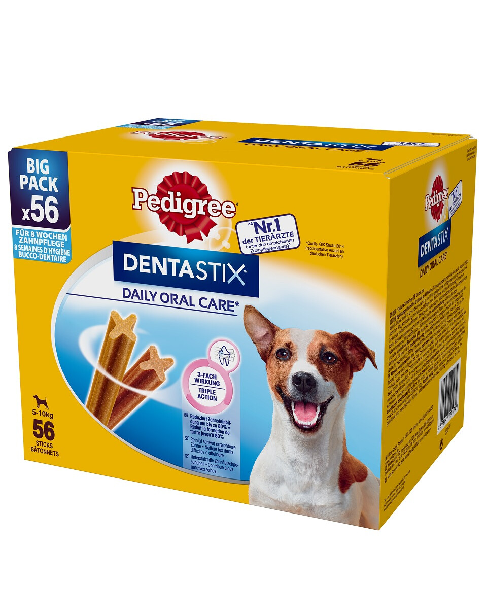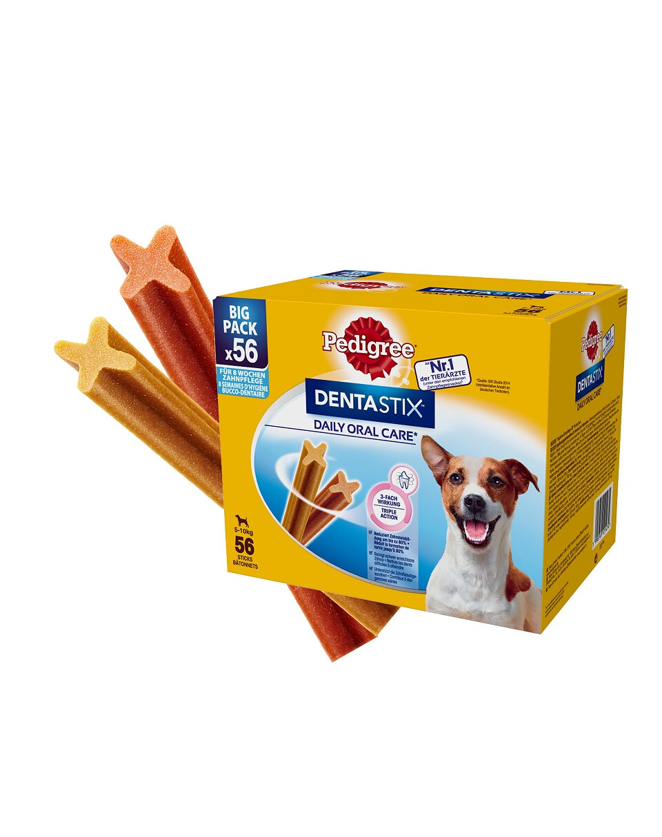 Ergänzungsfuttermittel PEDIGREE DentaSTIX Daily Oral Care sind Kaubonbons für Hunde über 4 Monate. Sie reinigen Zähne und Zahnfleisch und reduzieren das Zahnsteinwachstum erheblich. Dank ihrer Längsform und des X-förmigen Querschnitts helfen sie, auch schwer zugängliche Zähne zu reinigen. Wenn Sie Ihrem Hund PEDIGREE® DentaStix geben, achten Sie auf die Vitalität und Gesundheit Ihres Haustieres. Diese Größe ist für Hunde mit einem Körpergewicht von 5 bis 10 kg.