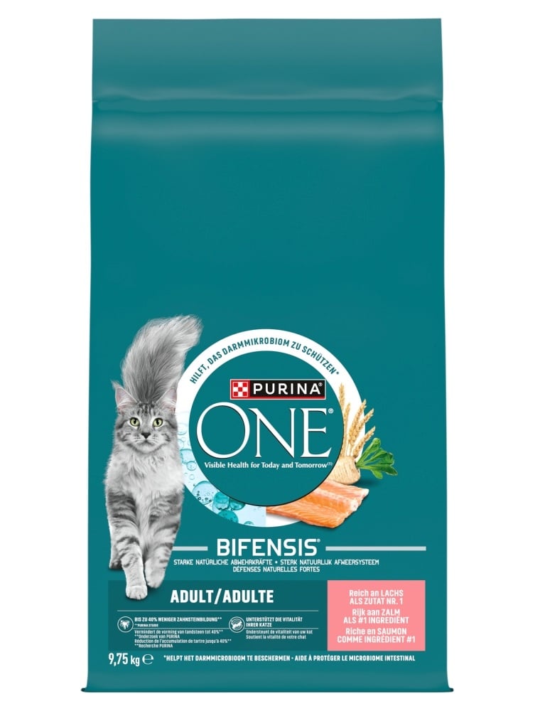 PURINA ONE BIFENSIS Adult Lachs und Weizen ist ein vollwertiges Trockenfutter für erwachsene Katzen, das das Immunsystem, die gesunde Verdauung und die tägliche Vitalität unterstützt.