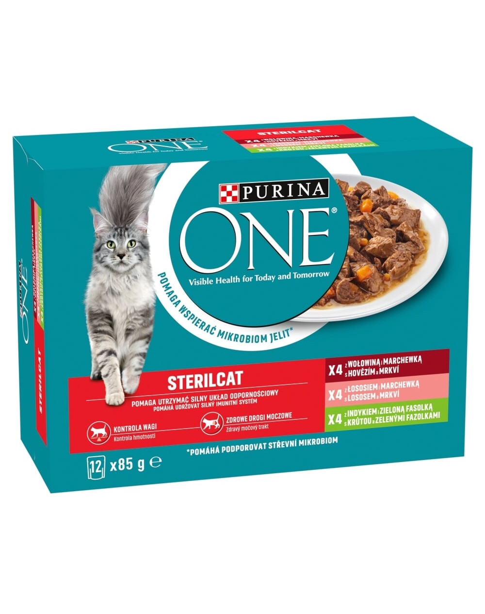 PURINA ONE Sterilcat ist ein vollwertiges Nassfutter für erwachsene Katzen nach der Sterilisation, erhältlich in Varianten mit Rind und Karotte, mit Lachs und Karotte sowie mit Pute und grünen Bohnen.