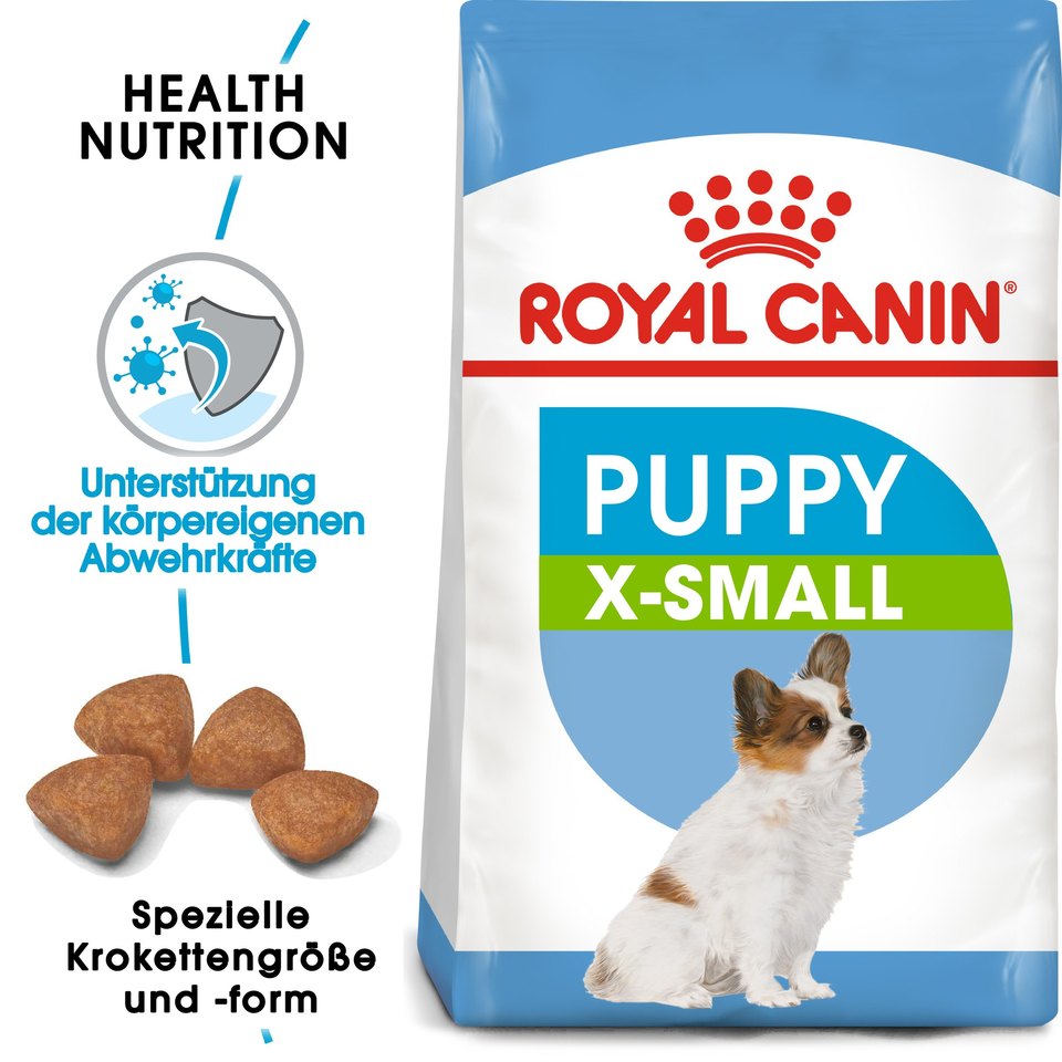 ROYAL CANIN X-Small Puppy Futter ist speziell auf die Bedürfnisse von Welpen sehr kleiner Hunderassen abgestimmt. Es sorgt für eine ausgewogene Ballaststoffzufuhr, was die Darmtätigkeit erleichtert und zu einer guten Stuhlqualität des Hundes beiträgt. Außerdem ist es entwickelt worden, um den erhöhten Energiebedarf von Welpen sehr kleiner Hunderassen innerhalb der Wachstumsphase zu decken.