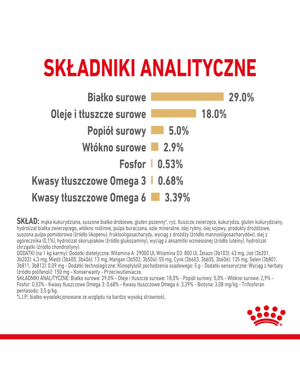 Maisfuttermehl, Geflügelprotein (getrocknet), Weizenkleberfutter*, Reis, Tierfett, Mais, Maiskleberfutter, tierisches Protein (hydrolysiert), Lignozellulose, Rübentrockenschnitzel, Mineralstoffe, Fischöl, Sojaöl, Hefeprodukte, getrocknete Tomaten (Quelle für Lykopen), Fructo-Oligosaccharide, Hefehydrolysat (Quelle für Mannan-Oligosaccharide), Borretschöl (0,1 %), Hydrolysat aus Krustentieren (Quelle für Glucosamin), Tagetesblütenmehl (Quelle für Lutein), Hydrolysat aus Knorpel (Quelle für Chondroitin).