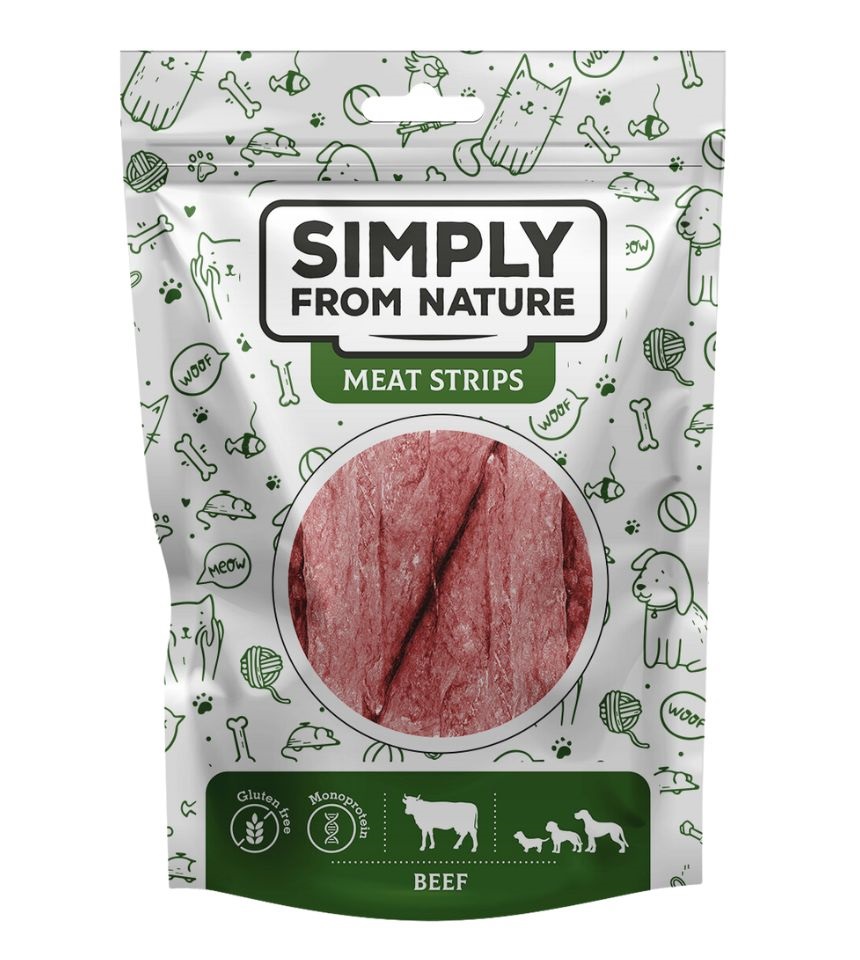 Ein gesunder und super leckerer Snack für Hunde mit Naschkatzen. Fleischige, getrocknete Rindfleischstreifen für Hunde sind die perfekte Ergänzung für den Tag Ihres Haustiers. Den Geschmack der Fleischstreifen von Simply from Nature wird niemand vergessen.