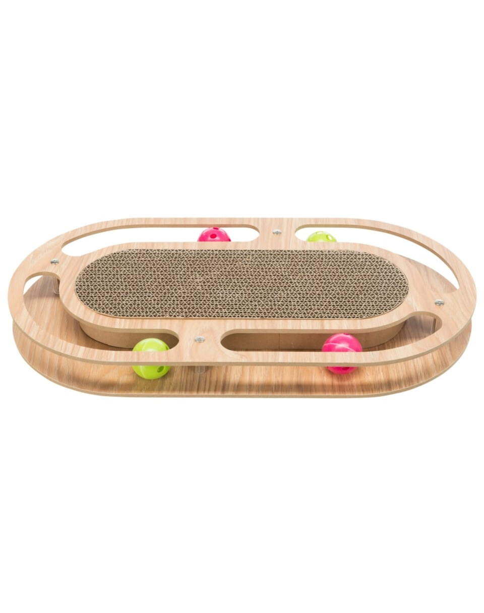 Kratzbaum aus Pappe mit Holzrahmen und Spielzeug.