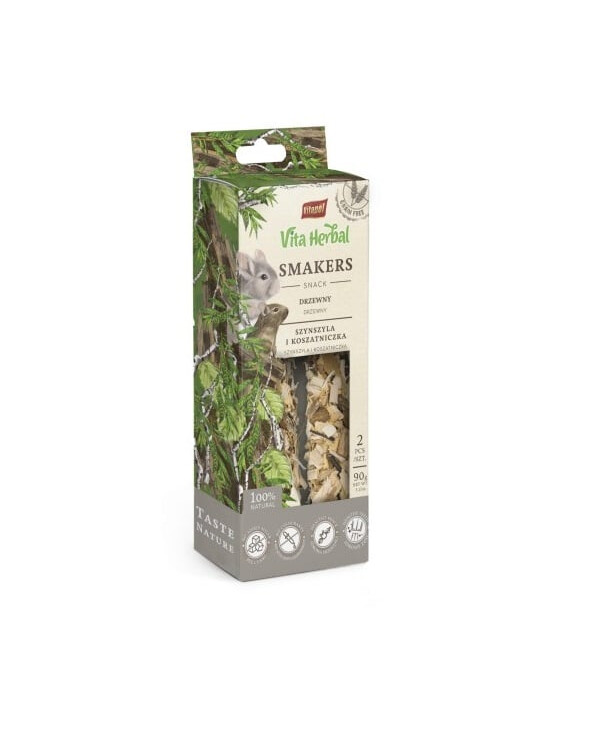 Vita Herbal Smakers ist ein 100% getreidefreies Leckerli, das ideal für Chinchillas und Meerschweinchen ist. Wood Smakers besteht, wie der Name schon sagt, aus der Rinde und den Zweigen von Laubbäumen. Er wirkt wie ein natürlicher Kaugummi für das richtige Abschleifen der Schneidezähne, und die harte Struktur des Treats fördert diesen Prozess zusätzlich. Darüber hinaus sind die Zweige und die Rinde eine hervorragende Quelle für Ballaststoffe und wirken sich positiv auf die Verdauung des Tieres aus, indem sie die Symptome von Durchfall und Darmkatarrh lindern. Smaker enthalten keinen Zucker- oder Honigzusatz.