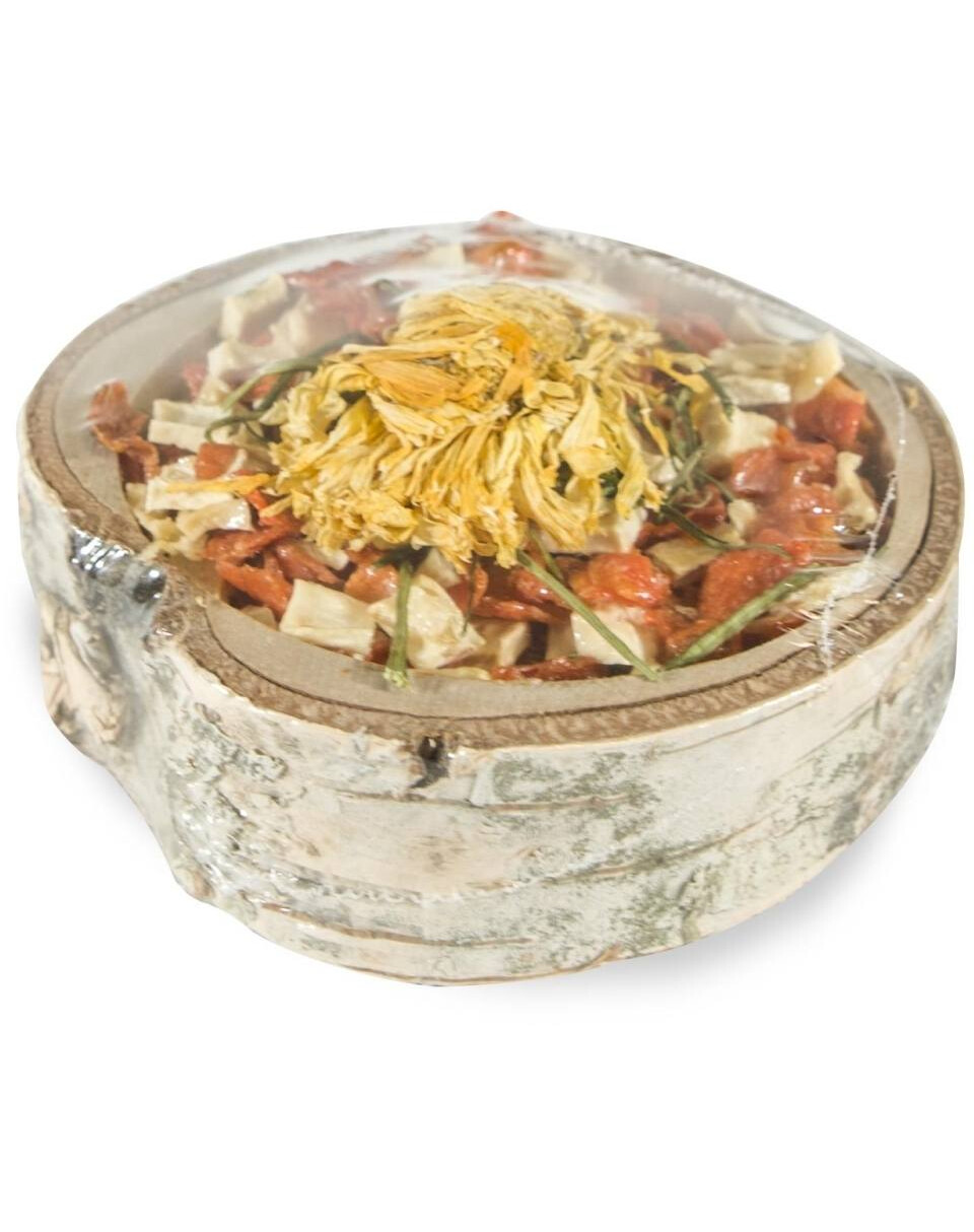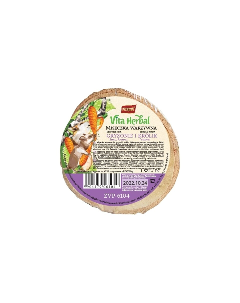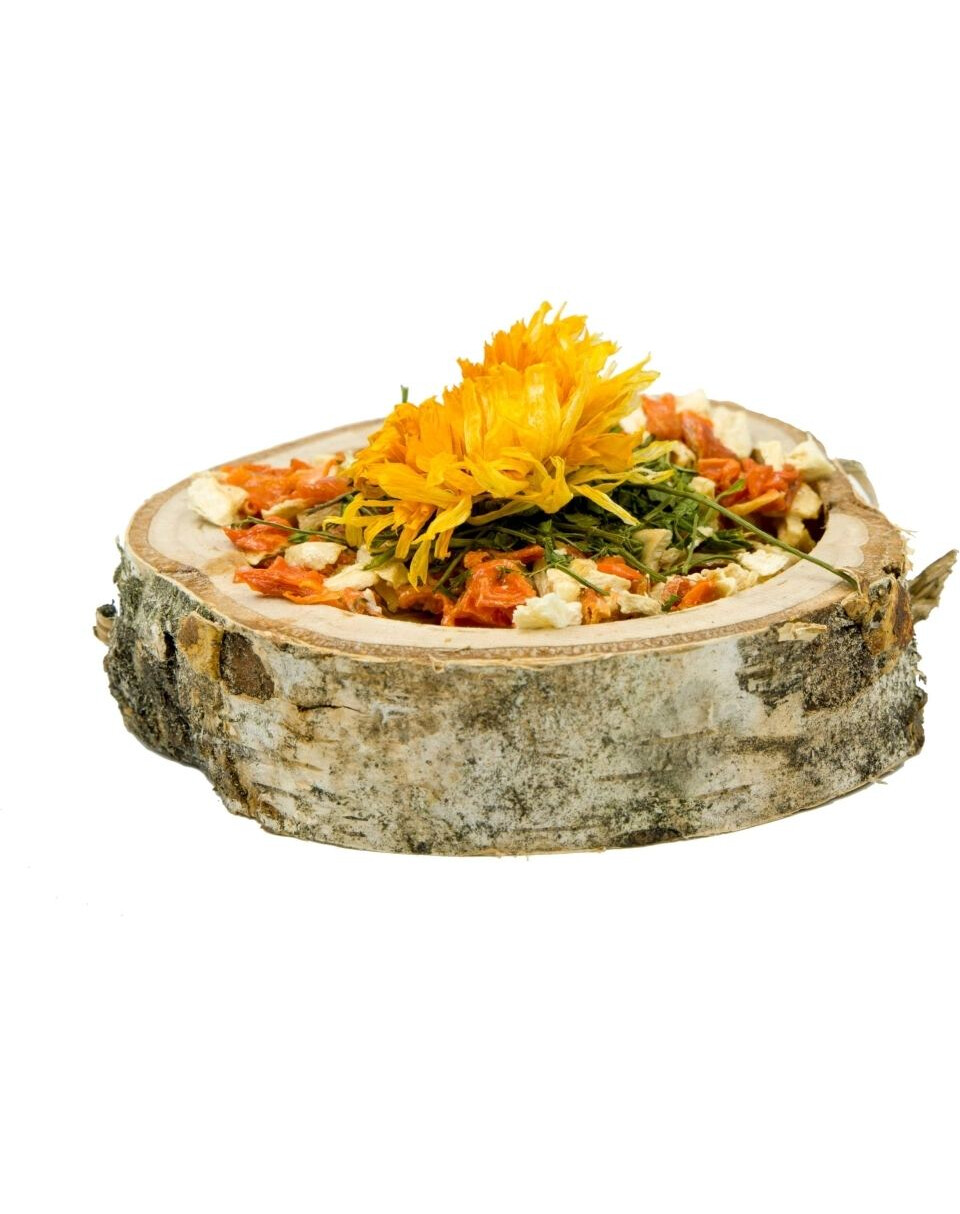 Gemüseschale aus Birke für Nagetiere und Kaninchen mit einem Ergänzungsfuttermittel, das für Abwechslung auf dem täglichen Speiseplan sorgt. Das in der Mischung enthaltene Gemüse ist eine Quelle von Vitaminen und Mineralien, die sich positiv auf den Zustand des Tieres auswirken.