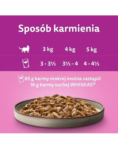 85 g Nassfutter können durch 16 g WHISKAS Trockenfutter ersetzt werden.