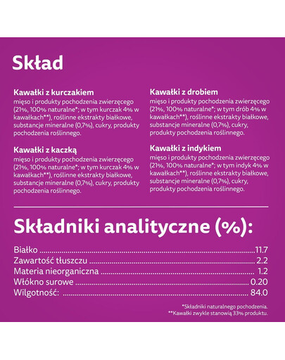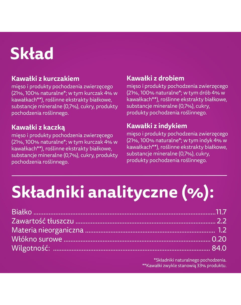 Stücke mit Geflügel - Zusammensetzung: Fleisch und Erzeugnisse tierischen Ursprungs (21%, 100% natürlich*; davon Geflügel 4% in Stücken**), pflanzliche Eiweißextrakte, Mineralstoffe (0,7%), Zucker, Erzeugnisse pflanzlichen Ursprungs.*Bestandteile natürlichen Ursprungs. **Teilstücke machen typischerweise 33% des Produkts aus.
