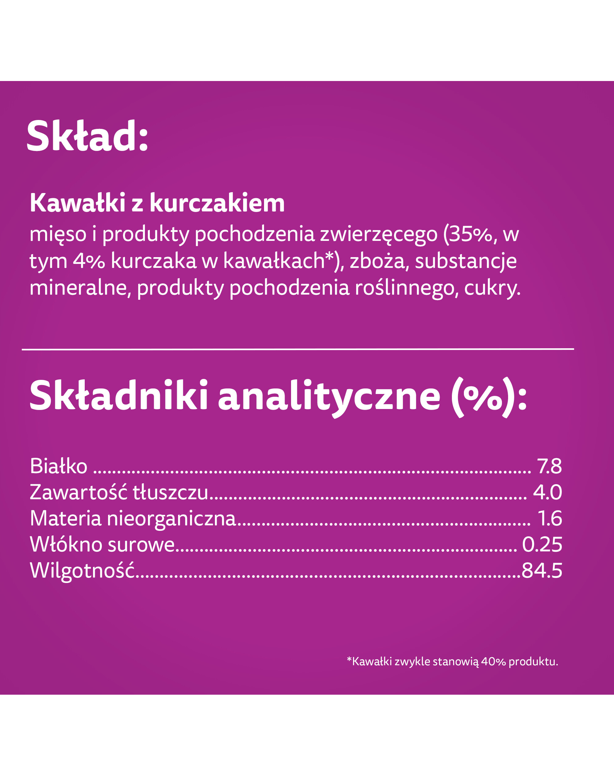 Zusammensetzung: Fleisch und tierische Erzeugnisse (35%, davon 4% Hühnerteile*), Getreide, Mineralstoffe, pflanzliche Erzeugnisse, Zucker. *Hühnerteile machen typischerweise 40% des Produkts aus.