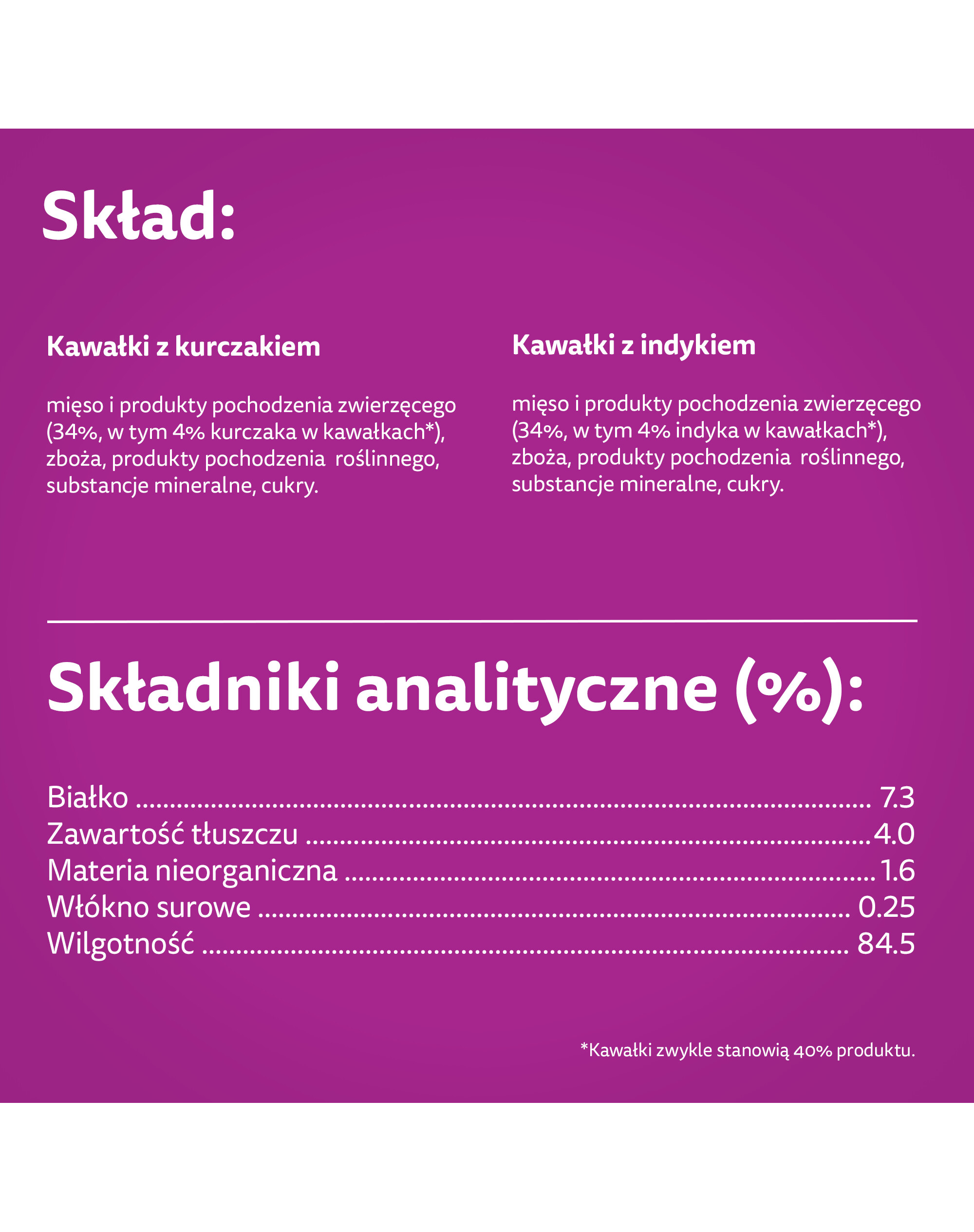 Stücke mit Pute - Zusammensetzung: Fleisch und Erzeugnisse tierischen Ursprungs (34%, davon 4% Putenstücke*), Getreide, Erzeugnisse pflanzlichen Ursprungs, Mineralstoffe, Zucker. *Stückchen machen typischerweise 40% des Produkts aus.