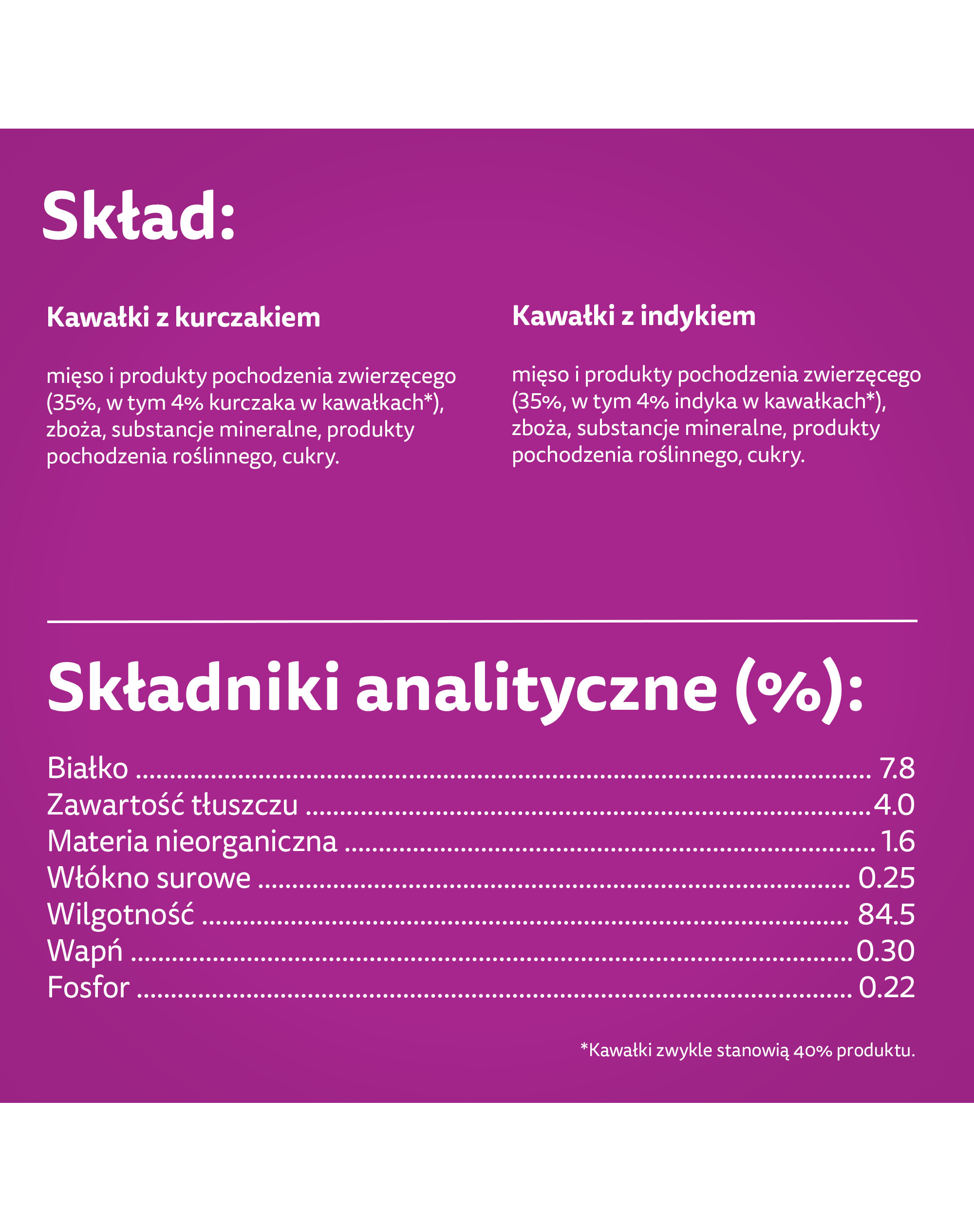 Stücke mit Pute - Zusammensetzung: Fleisch und Erzeugnisse tierischen Ursprungs (35%, davon 4% Putenstücke*), Getreide, Mineralstoffe, Erzeugnisse pflanzlichen Ursprungs, Zucker. *Die Stücke machen typischerweise 40% des Produkts aus.